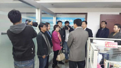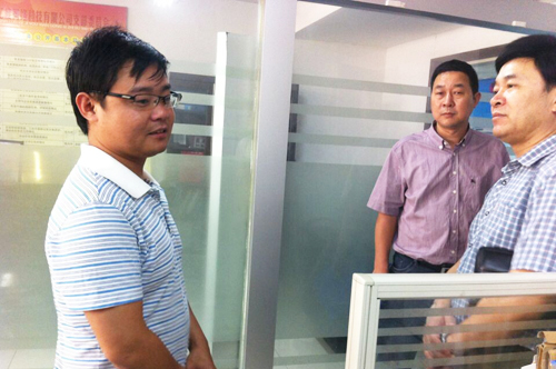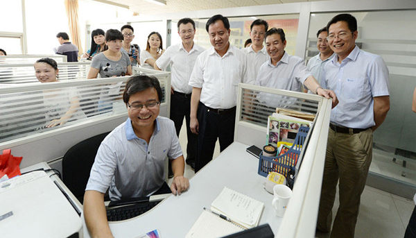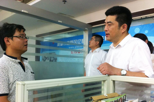 省政協(xié)副主席、省委組織部副部長(zhǎng)、市政協(xié)主席及新聞媒體一行就湘潭大學(xué)生科技創(chuàng)業(yè)園國(guó)家級(jí)創(chuàng)業(yè)孵化示范基地揭牌儀式,第一站實(shí)業(yè)參觀考察湘潭大學(xué)生科技創(chuàng)業(yè)園區(qū),地點(diǎn):創(chuàng)新大廈-十四樓創(chuàng)業(yè)企業(yè)(湘潭億度網(wǎng)絡(luò)科技有限公司)。